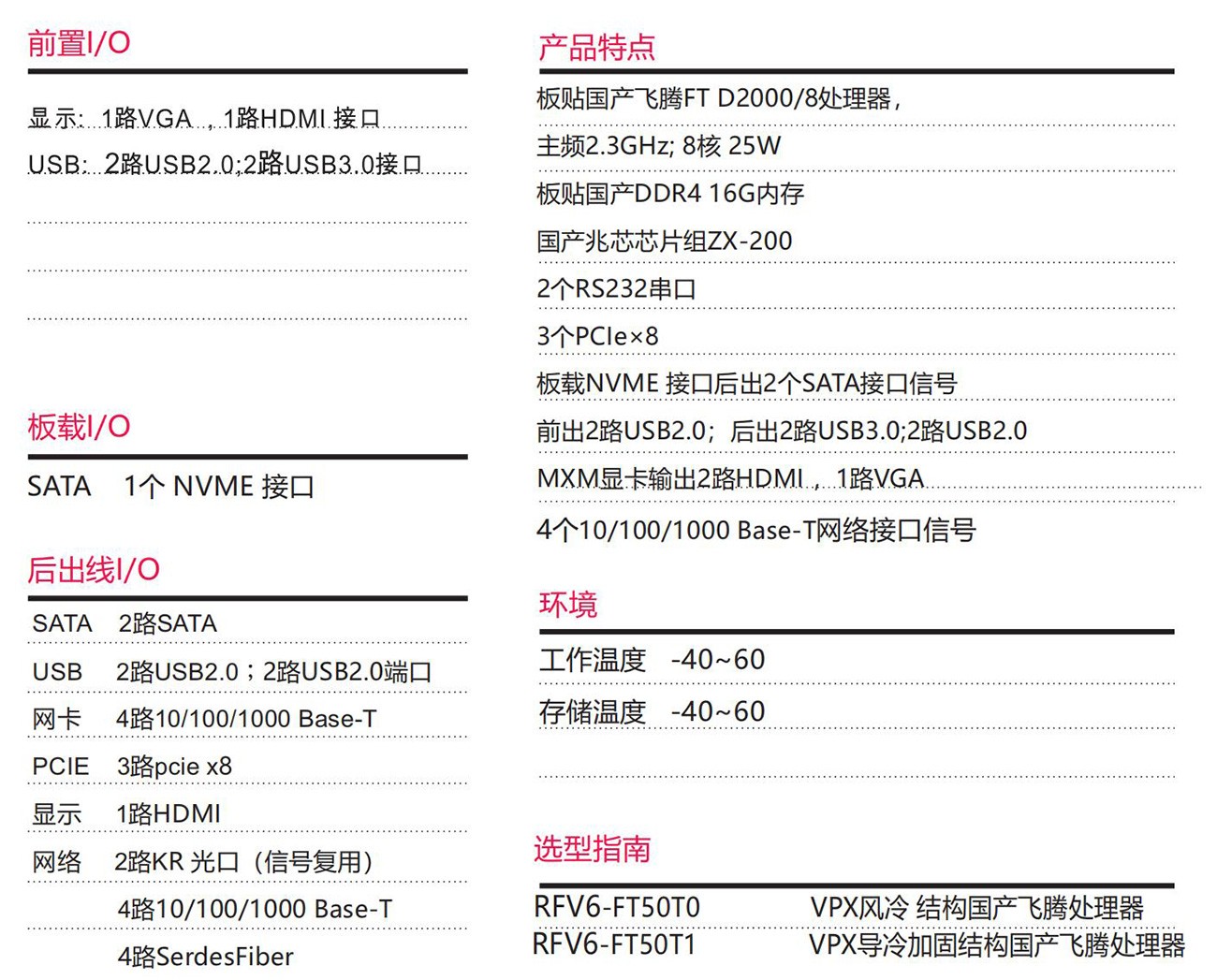 采用國產(chǎn)飛騰處理器FTD2000/8+ZX-200芯片組按國產(chǎn)設(shè)計,6U VPX規(guī)格。具備豐富的外圍接口;設(shè)計了高效 的散熱系統(tǒng),可顯著提高處理器的浮點運算性能,以太網(wǎng)、PCIe、支持高帶寬數(shù)據(jù)傳輸,滿足視頻采集與處理、 雷達(dá)和聲吶等應(yīng)用對高速數(shù)據(jù)傳輸?shù)囊蟆閻毫迎h(huán)境 使用而設(shè)計,滿足無人機(jī)、裝甲車、水面艦艇等軍工領(lǐng) 域。